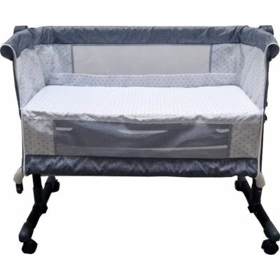 Patut co-sleeper pentru bebelusi Moni Mika Gri cu inaltime reglabila pe 7 nivele,roti cu frana,laterala detasabila,2 buzunare depozitare,laterale din plasa ventilatie,curele pentru fixare la patul parintilor,saltea inclusa